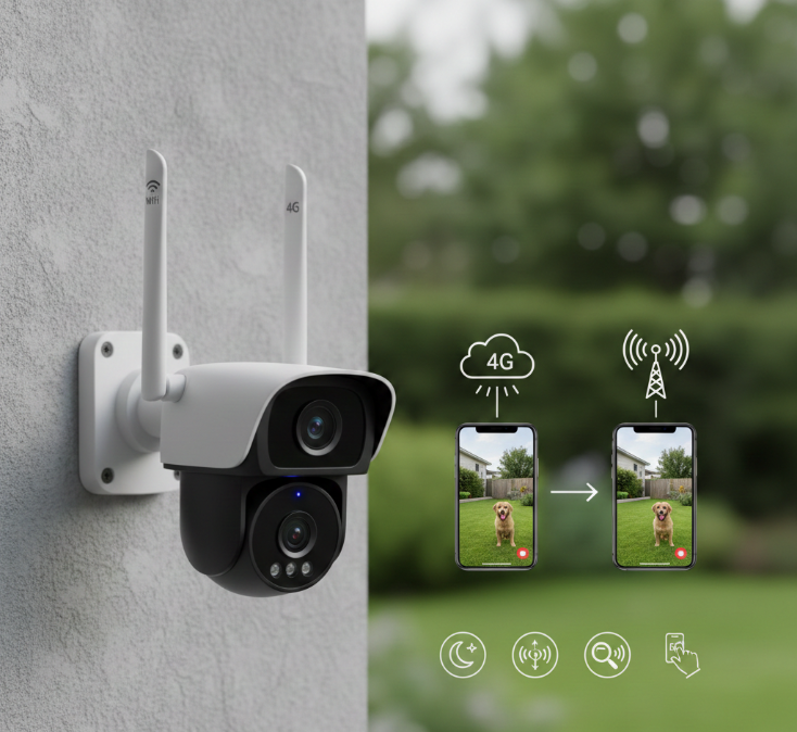 Flexible security with dual connectivity for reliable monitoring via WiFi or mobile 4G networks. Featuring HD video, night vision, motion detection, and mobile app access.